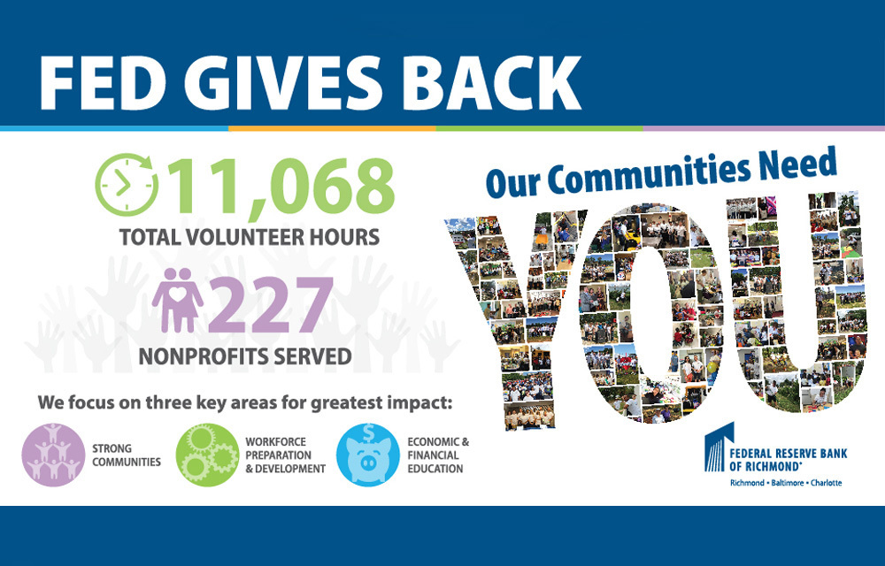 At the Richmond Fed, we’re committed to strengthening the economy and our communities – and we take that commitment seriously. Giving back and making a difference in our communities is important to our employees.