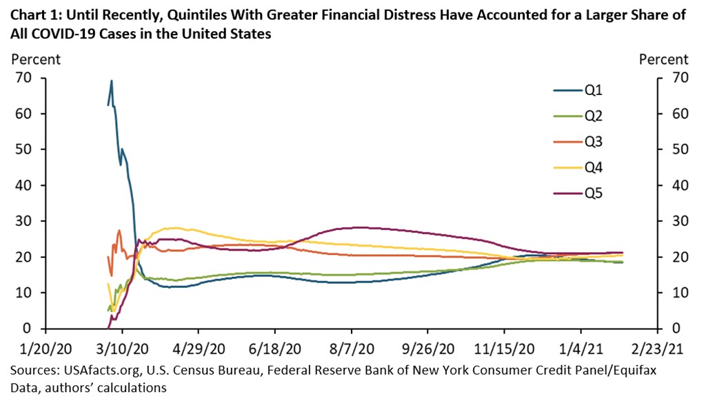 However, Chart 1 also shows that the cumulative case burden of the pandemic appears to have evened out more recently. As of January 31, counties in Q5 accounted for about 21 percent (5.5 million) of total cases in the United States, while counties in Q1 accounted for about 18 percent (4.8 million). Across all quintiles, the shares were close to 20 percent, which is what we would expect if infections were evenly distributed across the United States regardless of financial distress.