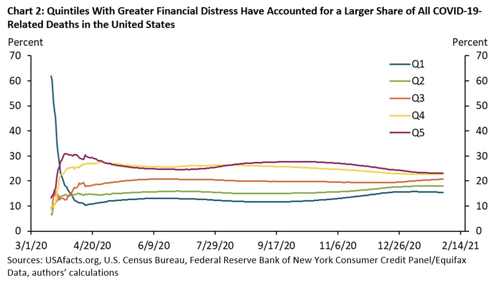 Instead, our results may be indicative of the role that wealth plays in determining life expectancy in the United States.6 Household income and wealth tend to fall as the incidence of financial distress rises.7 Thus, the differences in COVID-19 mortality we currently observe may persist, as they do for other causes of death.