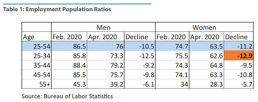 A third way to view employment among women is the employment-population ratio, which is the percentage of the population that is working. For both men and women, the April month-over-month drop in the employment-population ratio was the largest on record (records date back to 1948). Since the beginning of the crisis, the percentage of women between the ages of 25 and 54 who are working has fallen by 11.2 percentage points. The decline was largest among younger workers, ages 25 to 34. For women in this age group, the employment-population ratio declined by 12.9 percentage points between February and April. (See Table 1.)