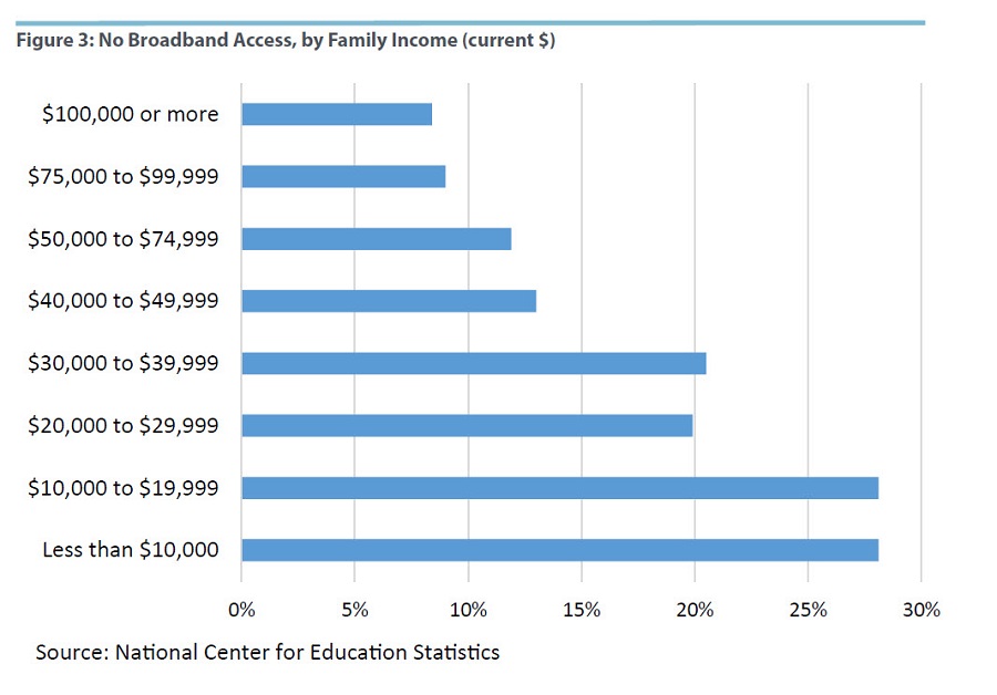 Another discrepancy is broadband access: Many schools are offering online instruction and resources, but these require reliable internet access. Nationwide, 14.3 percent of children between 3 and 18 years old lacked internet access in 2017, according to the National Center for Education Statistics (NCES). Access varies with family income, parents' educational attainment, race, and where the children reside, that is, in a metro area versus a non-metro area. (See Figures 1 through 4 for a summary of the data.) Data collected by the NCES also show that students with internet access at home tend to perform better on reading, math, and science tests. Differential access to digital learning will likely increase the achievement gaps among children from different family backgrounds even further.