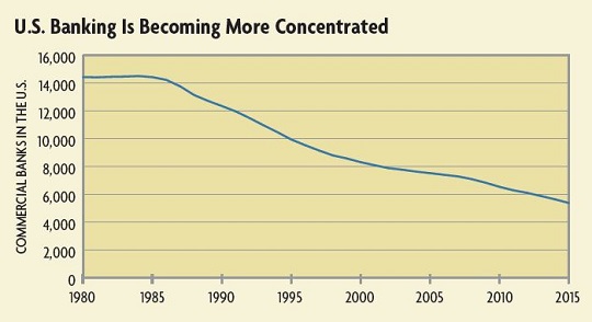 There is also some evidence that the recent changes in banking may be part of a longer trend. Small banks have been facing greater competition for small business loans from large banks. According to a 2015 paper by Julapa Jagtiani of the Philadelphia Fed and Catharine Lemieux of the Chicago Fed, community banks held 77 percent of of loans worth less than $1 million in 1997, but this share had fallen to 43 percent in 2015. For loans valued at less than $100,000, the decline is even more dramatic, with the share held by community banks falling from 82 percent in 1997 to 29 percent in 2015.