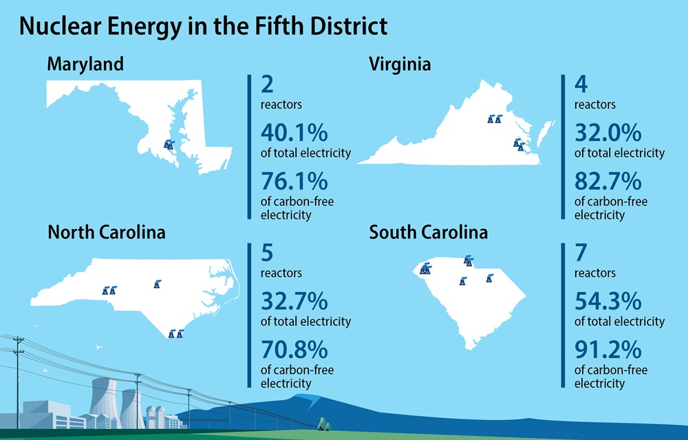 Nuclear energy provides about 20 percent of electricity in the United States, but close to 50 percent of carbon-free power. These shares are even higher for most Fifth District states. (See graphic.) But tripling nuclear capacity by 2050, as the United States and other nations pledged to do in 2023, would mean building around 200 additional reactors — a daunting task for a country that has only started and completed two in the last three decades.