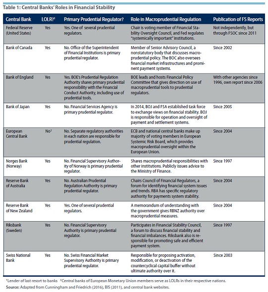 Bank for International Settlements, "Central Bank Governance and Financial Stability: A Report by a Study Group," May 2011; and Rose Cunningham and Christian Friedrich, "The Role of Central Banks in Promoting Financial Stability: An International Perspective," Bank of Canada Staff Discussion Paper No. 2016-15, July 2016.
