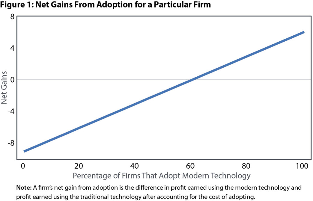 Figure 1 shows a simple example of complementarity in firms' technology-adoption decisions. For a particular firm, the figure shows the net gains from adoption, given by the difference between the firm's profits using the modern versus traditional technologies as a function of the percentage of all firms that adopt. In this hypothetical case, net gains from adoption for the firm increase with the percentage of firms that adopt the modern technology, and thus the firm's adoption decision is complementary to the decisions of other firms.