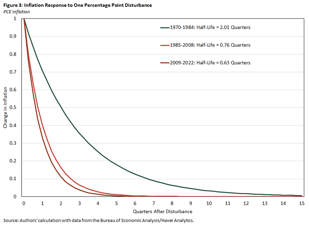 In the era 1970-1984, it takes (on average) a little more than two quarters for half the effects of a given inflation shock to dissipate. We see that 10 percent of a shock's effects are still lingering even two years later. In contrast, during the Great Moderation and post-Great Recession periods, it takes a little less than two months for half the effects of an inflation shock to dissipate.