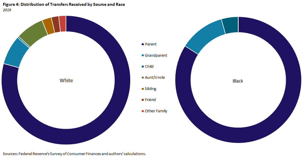 The figure reveals that among White respondents, 79 percent of transfers originate from the recipients' parents, 7 percent from their grandparents and 13 percent from other sources.6 Among Black respondents, 84 percent of transfers originate from the recipients' parents, 12 percent from their grandparents and only 4 percent from other sources. These differences may suggest that White families have broader financial support networks than their Black counterparts.