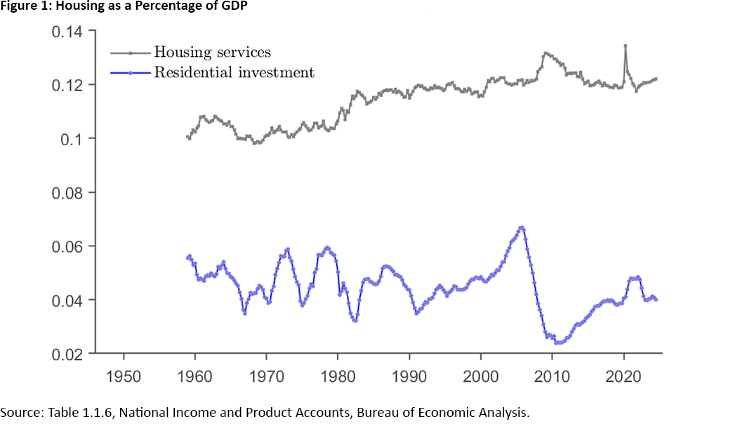 Figure 1 plots residential investment over time as a percent of GDP. Residential investment was about $1.1 trillion in the second quarter of 2024, is approximately 4 percent of GDP and is one of the most volatile components of GDP.