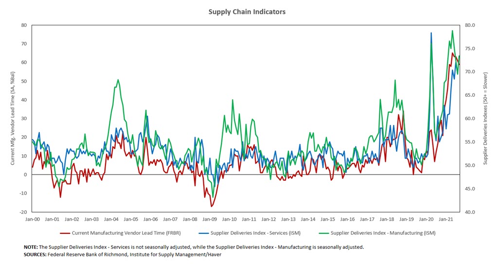Looking for signs of easing supply constraints can feel overwhelming, with the bottlenecks leaving fingerprints on everything from prices to inventories, production, order backlogs and delivery times. A recent New York Times article discussed how supply chain problems have manifested as a record backlog of cargo ships are waiting to unload at California ports. When conditions do start to improve, it will take time for the improvements to percolate through the entire supply chain and show up in the economic indicators. For example, some firms may not immediately pass along lower logistics costs to their customers.