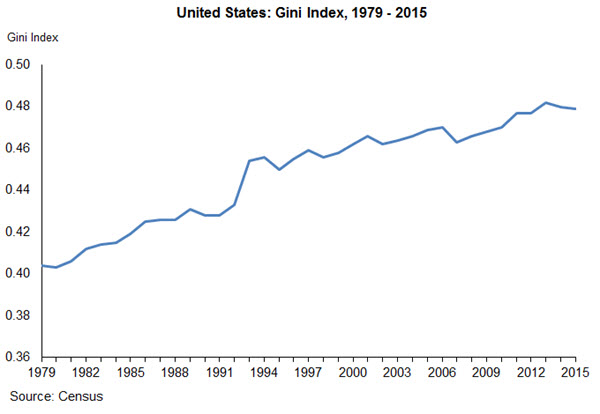 The same report suggested that income inequality did not change much from 2014 to 2015. The standard measure of income inequality is the Gini index (sometimes called the Gini coefficient). The Gini index summarizes the entire distribution of income in a single metric ranging from zero to one. A Gini index of zero would result if income were distributed equally across all groups, while a value of one indicates that all of the income is received by the highest-income group, with none going to the lower-income groups. This metric can be used to compare a single region over time or to compare geographic units such as states or countries. The U.S. Gini index has been on the rise: In 1979, the U.S. Gini index was 0.404, but by 2015, it had risen to 0.479 (see chart below).