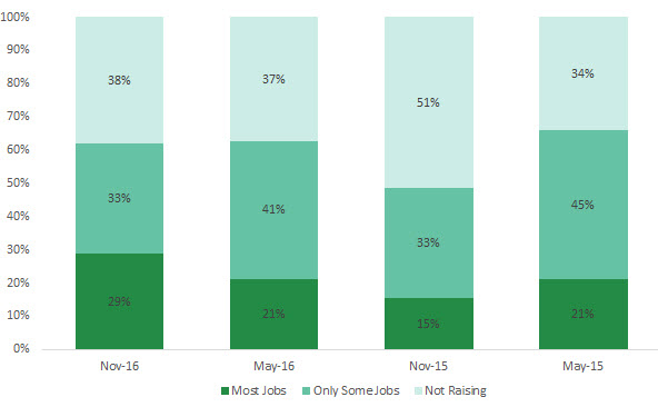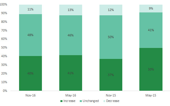 As can be seen from the chart below, results in May and November of 2016 are remarkably similar but differ slightly from the results in 2015. In November 2015, only 37 percent of employers polled said they were planning on hiring over the next year. In May 2015, however, half of the respondents indicated plans to increase employment.