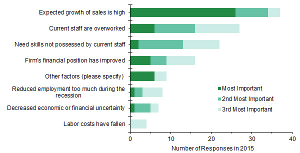 Both in the most recent survey and in the November 2015 survey, participants who intended to increase employment were asked to give the top three reasons for expecting to raise employment. The charts below show that the most important factor in both survey periods was that the expected growth of sales was high; that response received both the highest number of votes for “most important” and the greatest number of combined votes. The second and third most commonly selected answers were the same in both surveys but flipped in order. In the most recent survey, “need skills not possessed by current staff” had very slightly more total responses than “current staff are overworked.”