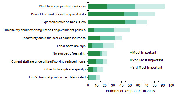 The above shows that, when asked to select reasons for not hiring, the three most popular answers were the same in both years when you consider the combined number of responses. However, if you consider just the "most important" factor (the dark green segments), this year the top response was that expected sales were low, while last year the most important factor was difficulty finding workers with the required skills.