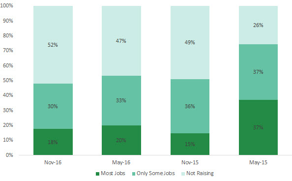 As you can see in the chart above, in the current survey period, 29 percent of respondents answered that they were raising starting wages for most categories, which was the largest share to give that answer over the last four surveys. If you combine the responses for "most jobs" and "only some jobs," the current survey looks very similar to the ones in May 2016 and May 2015, all of which were considerably higher than in November 2015.